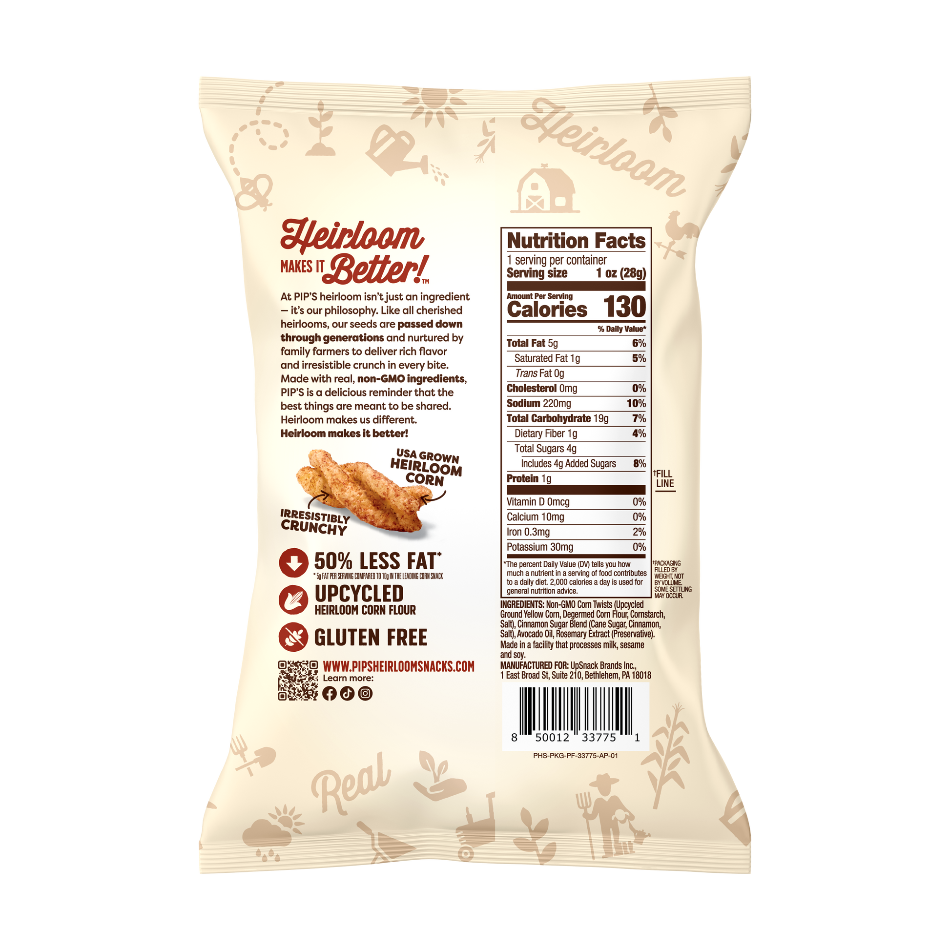 Perfect for on-the-go snacking! Light, airy and irresistibly crispy! Made with upcycled Heirloom corn flour, Cinnamon Sugar blend, and Avocado Oil. At PIP’S, heirloom isn’t just an ingredient — it’s our philosophy. Like all cherished heirlooms, our seeds are passed down through generations and nurtured by family farmers to deliver rich flavor and irresistible crunch in every bite. Made with real, non-GMO ingredients, PIP’S Snack Size Cinnamon Sugar Twists are a delicious reminder that the best things are meant to be shared. Heirloom makes us different. Heirloom makes it better.