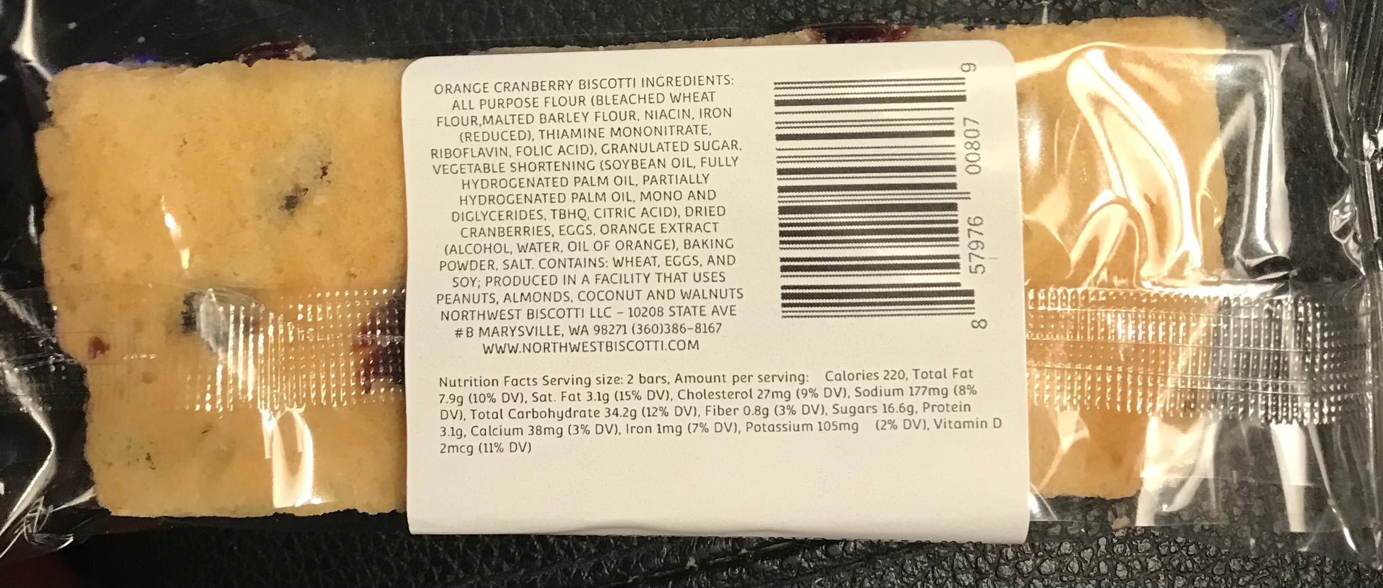 Two pieces of orange flavored biscotti with dried cranberries, convenient snacks for when you're on the move. Store in a dry/cool place for full shelf life.